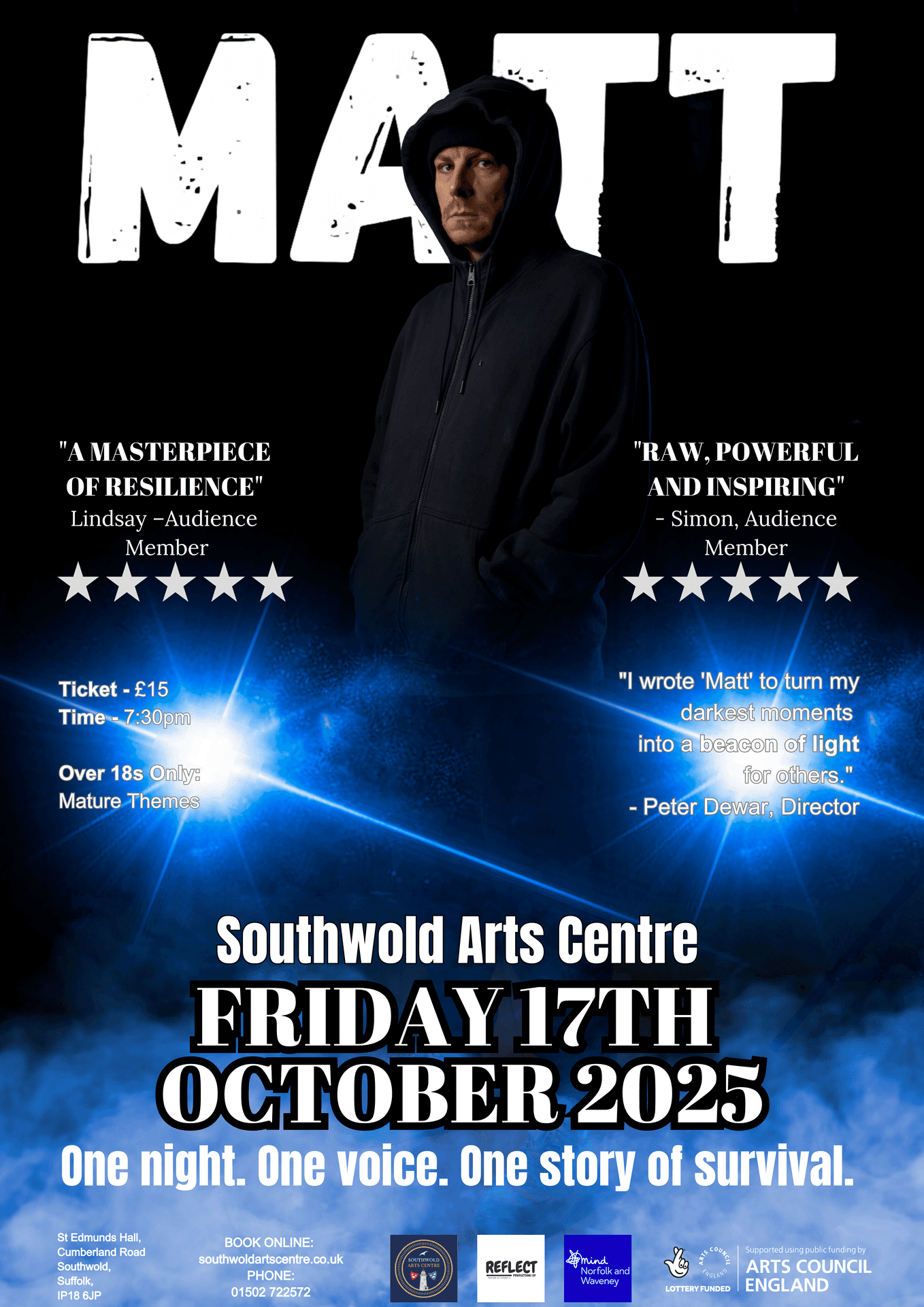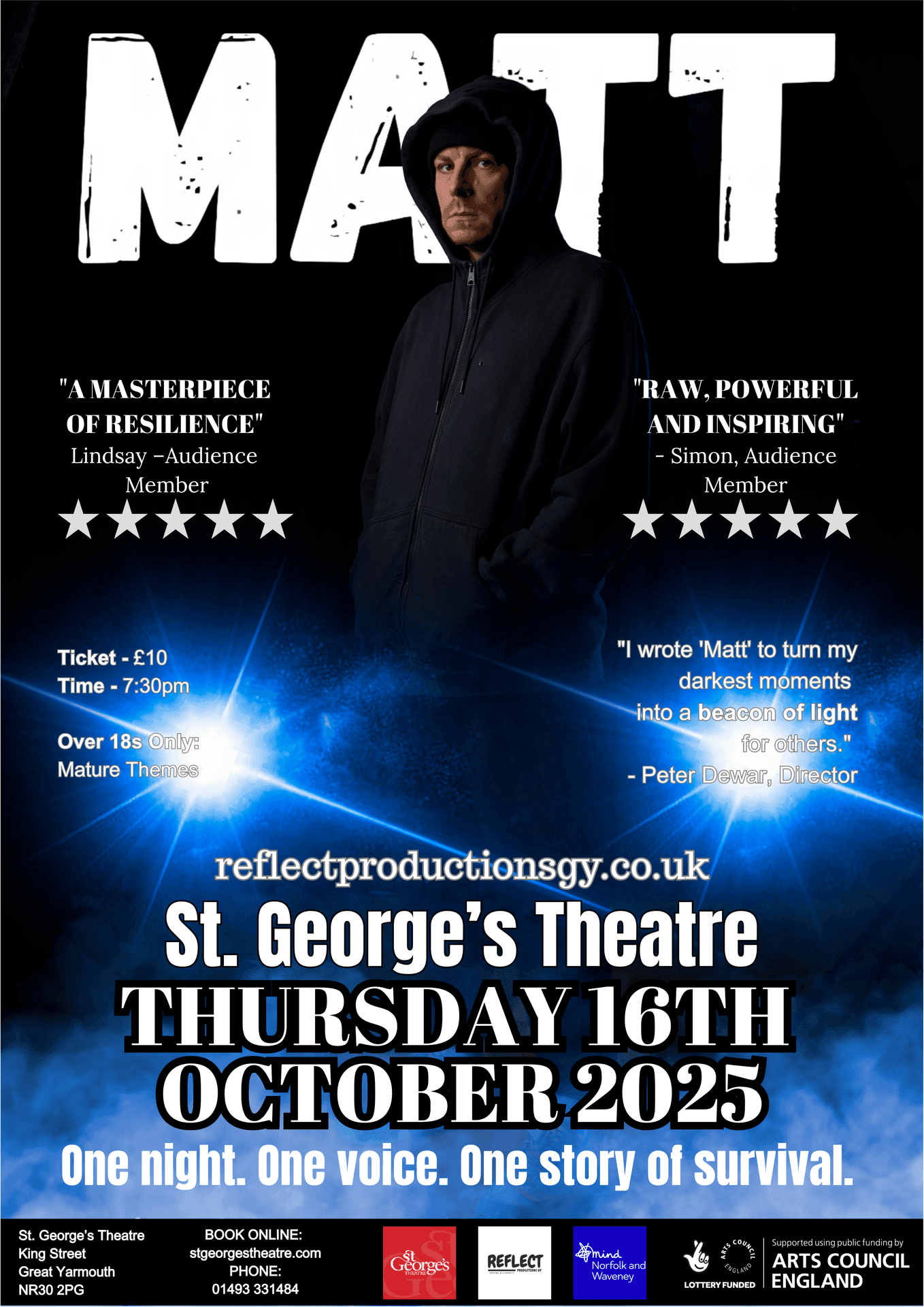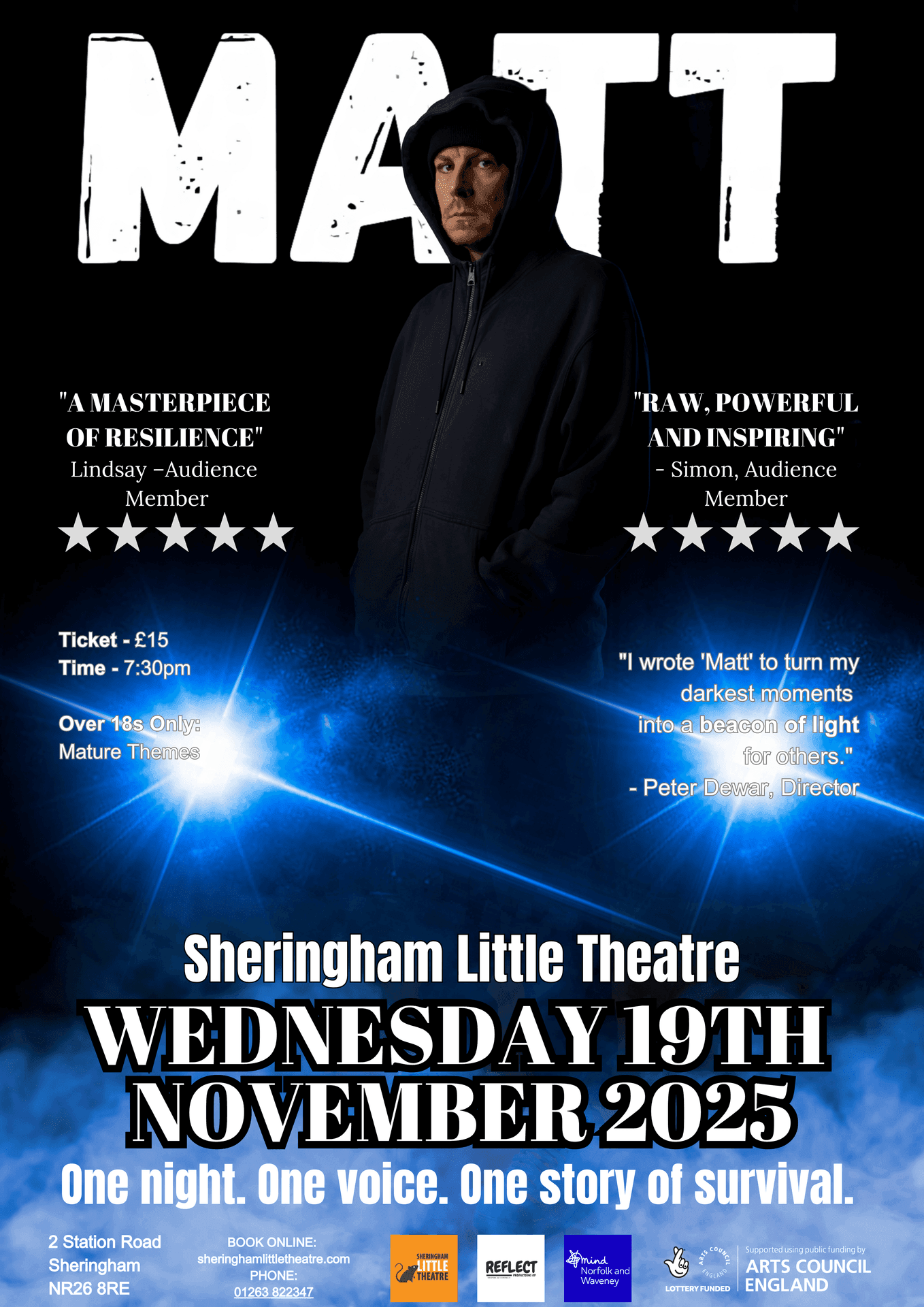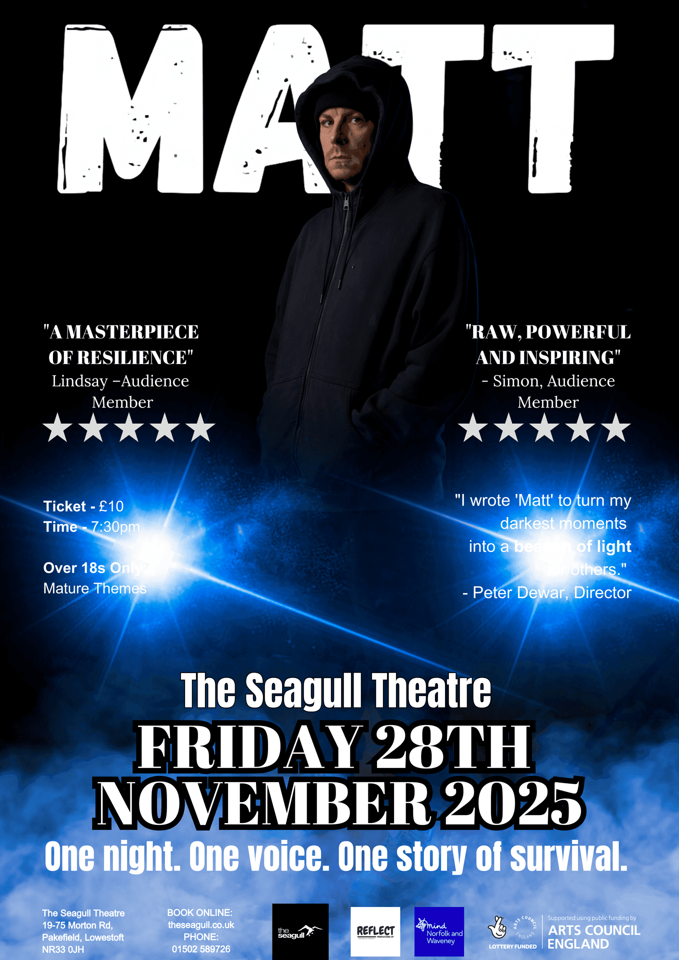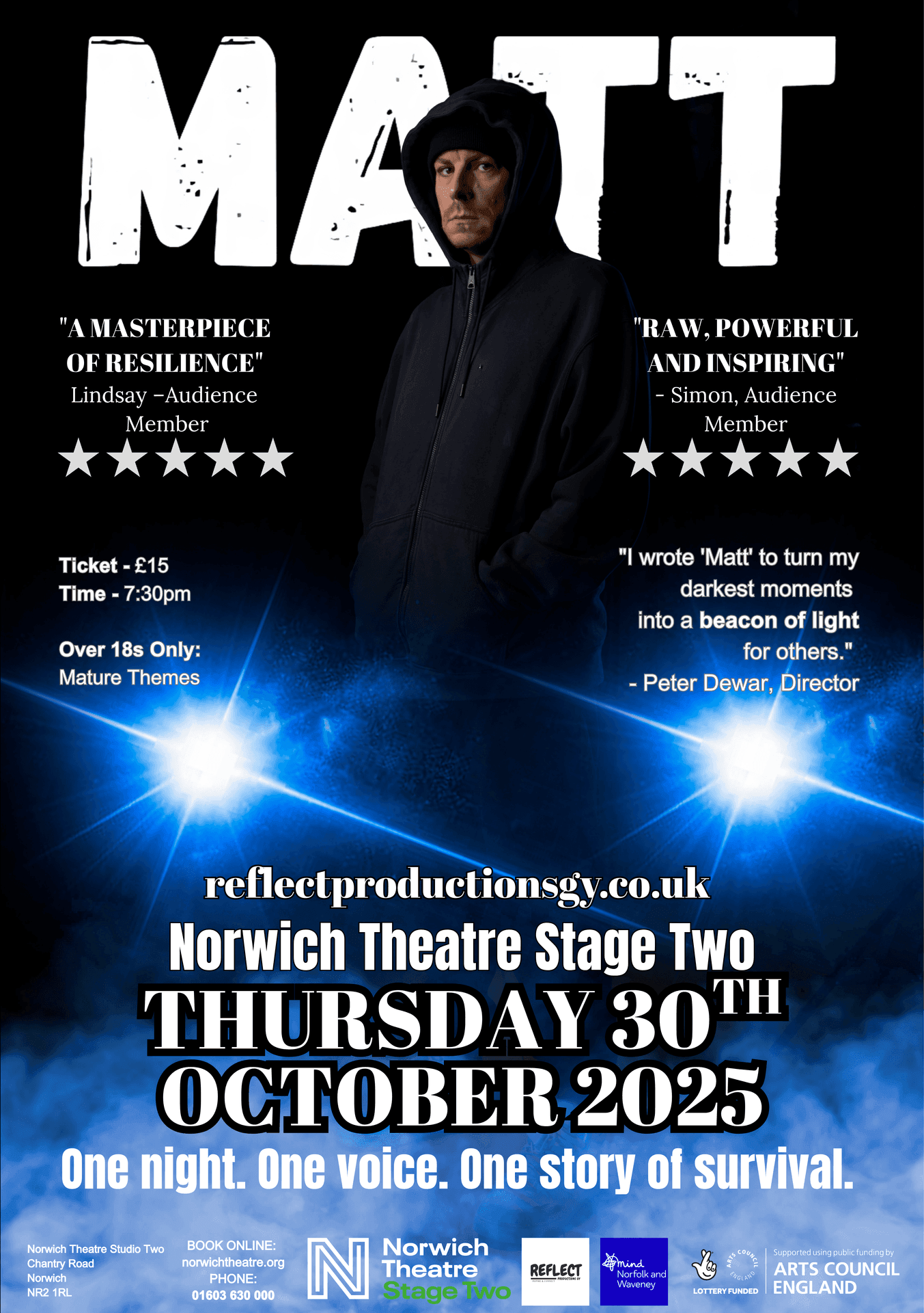 Experience the raw, powerful story that’s changing lives across Norfolk and Suffolk. Matt is more than a theatre show — it’s a movement. A gripping and emotional performance that dives into mental health, hope, and healing. Performed live across select venues, this critically praised production is now on tour — and seats are limited.